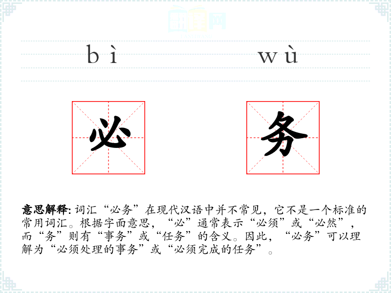 - 词源:由于“必务”不是一个常用词汇,其词源不明确,可能是由“必”和“务”两个常用词汇组合而成。