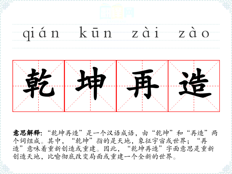 “乾坤再造”是一个汉语成语,由“乾坤”和“再造”两个词组成。其中,“乾坤”指的是天地,象征宇宙或世界;“再造”意味着重新创造或重建。因此,“乾坤再造”字面意思是重新创造天地,比喻彻底改变局面或重建一个全新的世界。