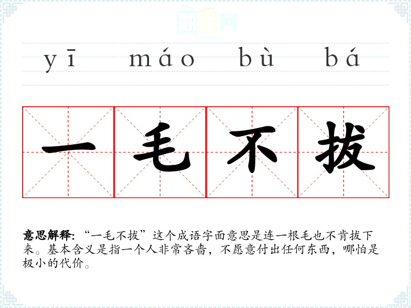 “一毛不拔”这个成语字面意思是连一根毛也不肯拔下来。基本含义是指一个人非常吝啬,不愿意付出任何东西,哪怕是极小的代价。