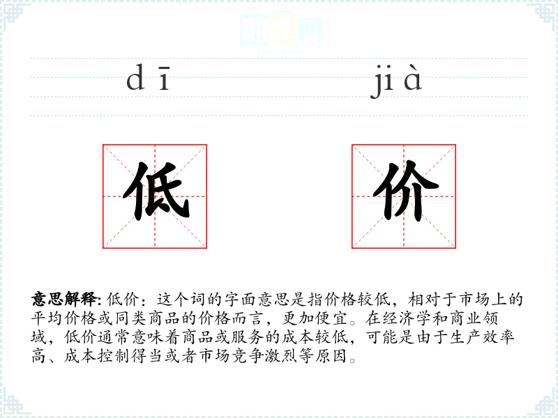 低价:这个词的字面意思是指价格较低,相对于市场上的平均价格或同类商品的价格而言,更加便宜。在经济学和商业领域,低价通常意味着商品或服务的成本较低,可能是由于生产效率高、成本控制得当或者市场竞争激烈等原因。