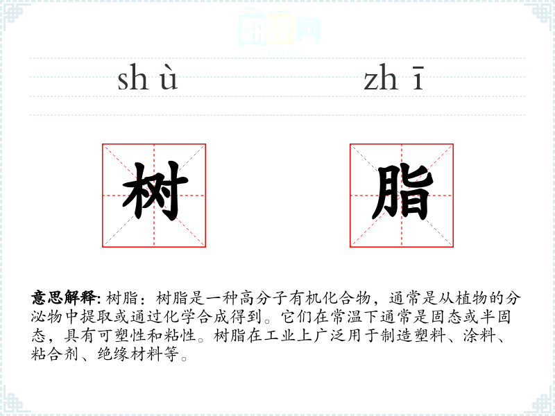 - 反义词:金属、陶瓷、玻璃(这些材料通常与树脂在性质和用途上形成对比)
