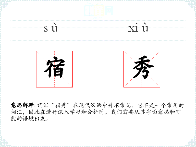 词汇“宿秀”在现代汉语中并不常见,它不是一个常用的词汇,因此在进行深入学习和分析时,我们需要从其字面意思和可能的语境出发。