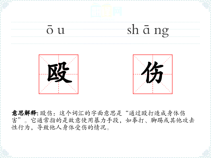 殴伤:这个词汇的字面意思是“通过殴打造成身体伤害”。它通常指的是故意使用暴力手段,如拳打、脚踢或其他攻击性行为,导致他人身体受伤的情况。