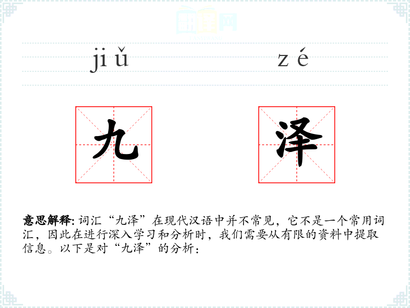 由于“九泽”不是一个常用词汇,它在现代文学、口语或专业领域中的使用非常有限。在古代文献中,它可能出现在描述地理环境或历史**的语境中。
