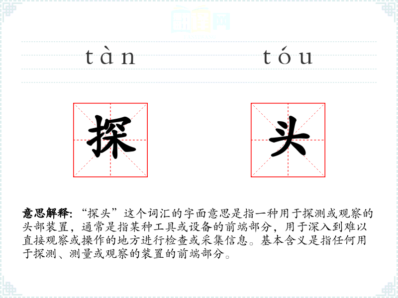“探头”这个词汇的字面意思是指一种用于探测或观察的头部装置,通常是指某种工具或设备的前端部分,用于深入到难以直接观察或操作的地方进行检查或采集信息。基本含义是指任何用于探测、测量或观察的装置的前端部分。