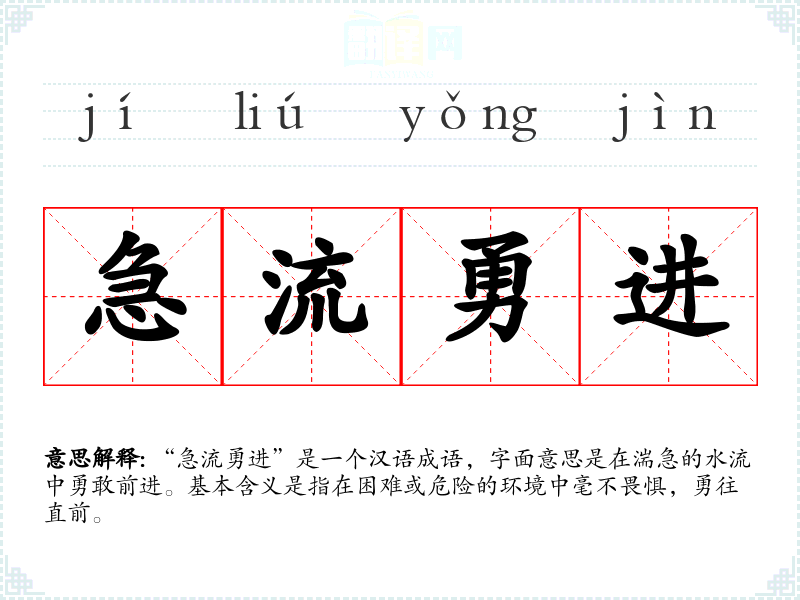 “急流勇进”是一个汉语成语,字面意思是在湍急的水流中勇敢前进。基本含义是指在困难或危险的环境中毫不畏惧,勇往直前。