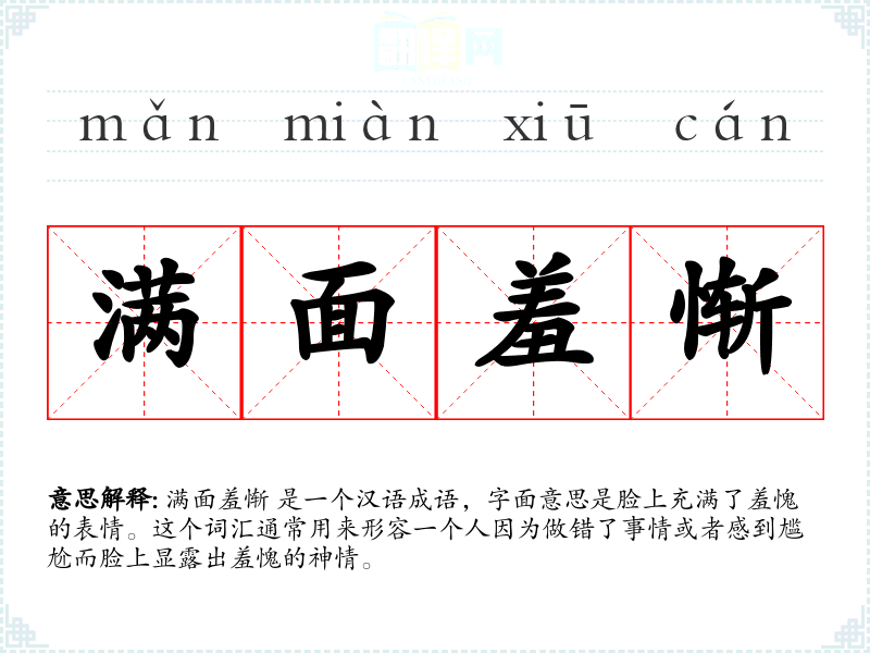 满面羞惭 是一个汉语成语,字面意思是脸上充满了羞愧的表情。这个词汇通常用来形容一个人因为做错了事情或者感到尴尬而脸上显露出羞愧的神情。