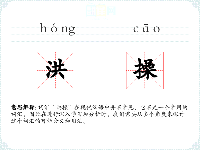 词汇“洪操”在现代汉语中并不常见,它不是一个常用的词汇,因此在进行深入学习和分析时,我们需要从多个角度来探讨这个词汇的可能含义和用法。