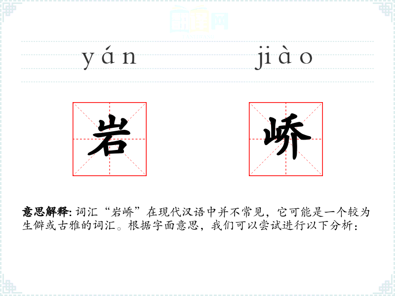 词汇“岩峤”在现代汉语中并不常见,它可能是一个较为生僻或古雅的词汇。根据字面意思,我们可以尝试进行以下分析: