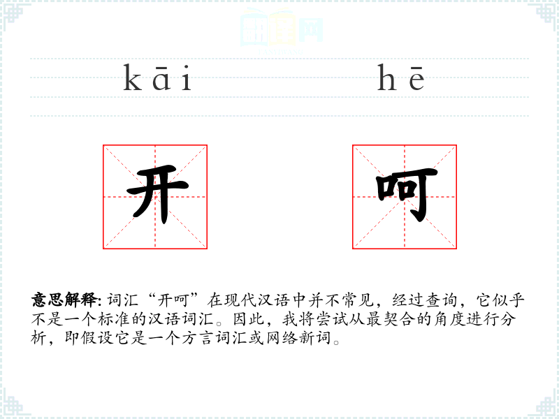 词汇“开呵”在现代汉语中并不常见,经过查询,它似乎不是一个标准的汉语词汇。因此,我将尝试从最契合的角度进行分析,即假设它是一个方言词汇或网络新词。