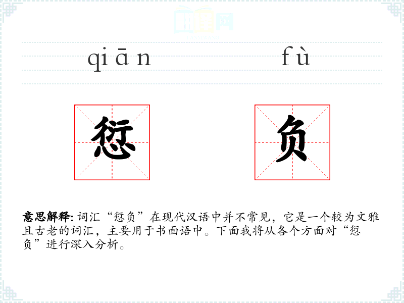 词汇“愆负”在现代汉语中并不常见,它是一个较为文雅且古老的词汇,主要用于书面语中。下面我将从各个方面对“愆负”进行深入分析。