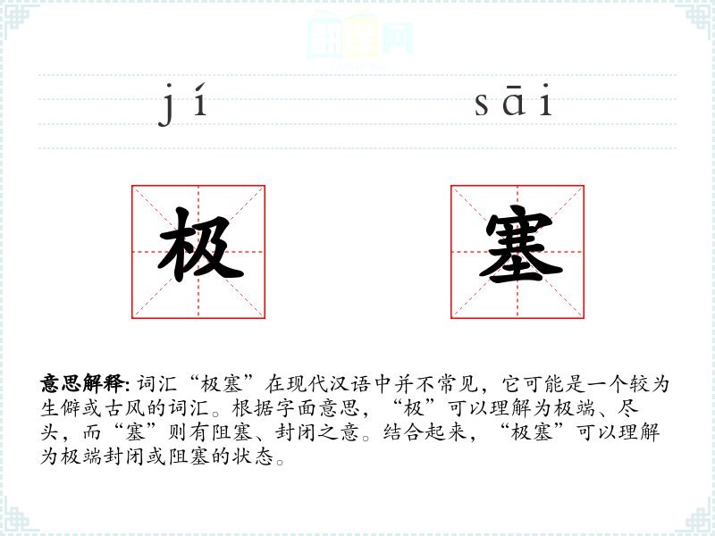 词汇“极塞”在现代汉语中并不常见,它可能是一个较为生僻或古风的词汇。根据字面意思,“极”可以理解为极端、尽头,而“塞”则有阻塞、封闭之意。结合起来,“极塞”可以理解为极端封闭或阻塞的状态。