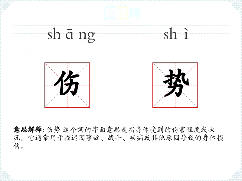 伤势 这个词的字面意思是指身体受到的伤害程度或状况。它通常用于描述因事故、战斗、疾病或其他原因导致的身体损伤。