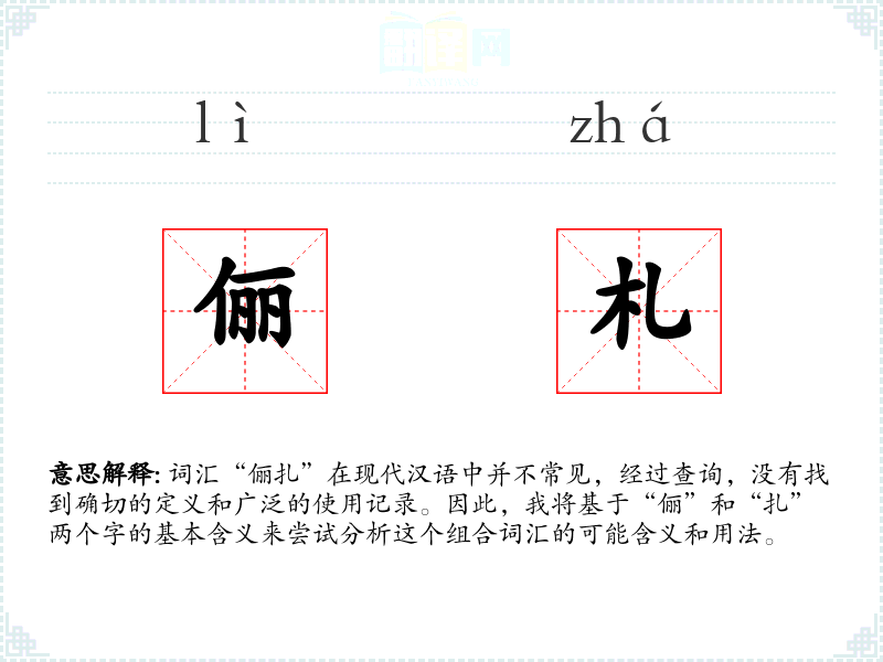 词汇“俪扎”在现代汉语中并不常见,经过查询,没有找到确切的定义和广泛的使用记录。因此,我将基于“俪”和“扎”两个字的基本含义来尝试分析这个组合词汇的可能含义和用法。