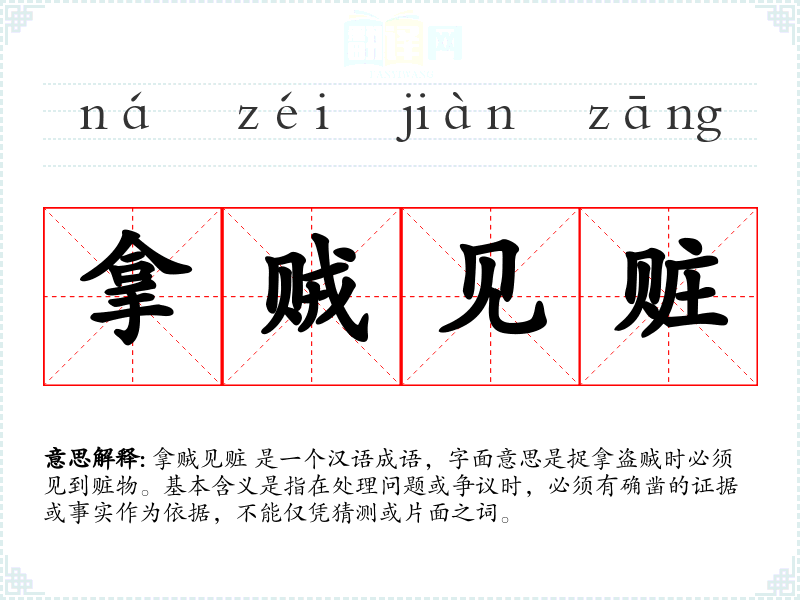 拿贼见赃 是一个汉语成语,字面意思是捉拿盗贼时必须见到赃物。基本含义是指在处理问题或争议时,必须有确凿的证据或事实作为依据,不能仅凭猜测或片面之词。