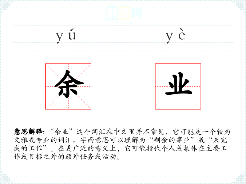 “余业”这个词汇在中文里并不常见,它可能是一个较为文雅或专业的词汇。字面意思可以理解为“剩余的事业”或“未完成的工作”。在更广泛的意义上,它可能指代个人或集体在主要工作或目标之外的额外任务或活动。