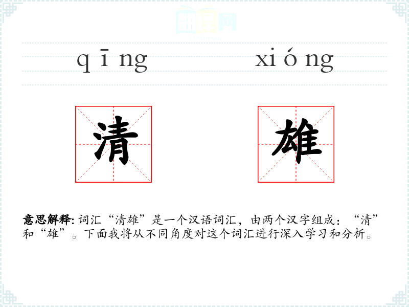 - “清”和“雄”都是古代汉语中常用的词汇,各自有着悠久的历史。