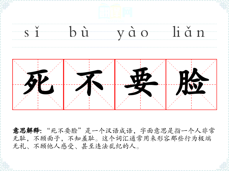 “死不要脸”是一个汉语成语,字面意思是指一个人非常无耻,不顾面子,不知羞耻。这个词汇通常用来形容那些行为极端无礼、不顾他人感受、甚至违法乱纪的人。