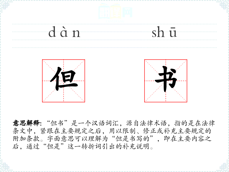 “但书”是一个汉语词汇,源自法律术语,指的是在法律条文中,紧跟在主要规定之后,用以限制、修正或补充主要规定的附加条款。字面意思可以理解为“但是书写的”,即在主要内容之后,通过“但是”这一转折词引出的补充说明。