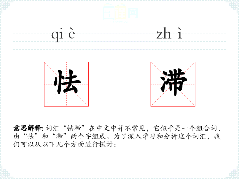 词汇“怯滞”在中文中并不常见,它似乎是一个组合词,由“怯”和“滞”两个字组成。为了深入学习和分析这个词汇,我们可以从以下几个方面进行探讨: