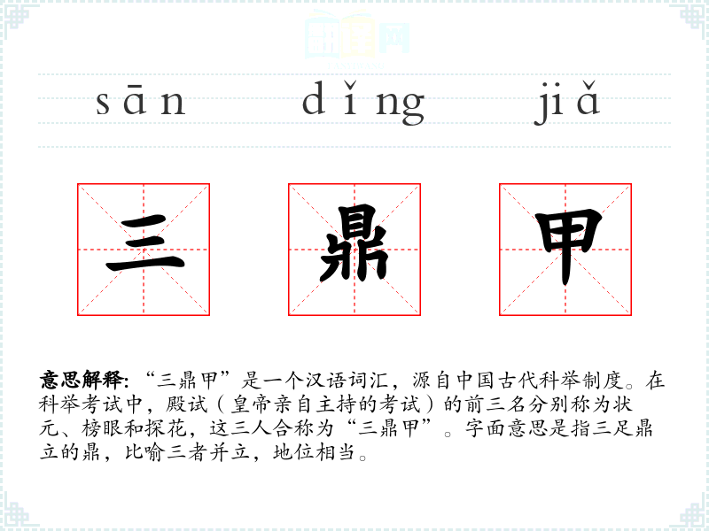 - 同义词:三杰、三巨头(这些词汇也用来形容在某领域中表现最出色的三个人或团体,但“三鼎甲”特指科举考试的前三名)