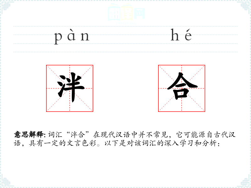 词汇“泮合”在现代汉语中并不常见,它可能源自古代汉语,具有一定的文言色彩。以下是对该词汇的深入学*和分析: