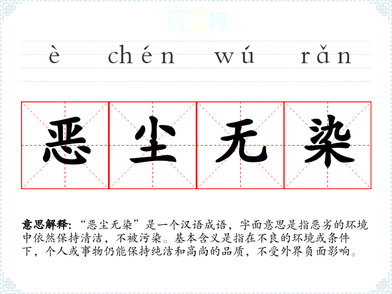 “恶尘无染”是一个汉语成语,字面意思是指恶劣的环境中依然保持清洁,不被污染。基本含义是指在不良的环境或条件下,个人或事物仍能保持纯洁和高尚的品质,不受外界负面影响。