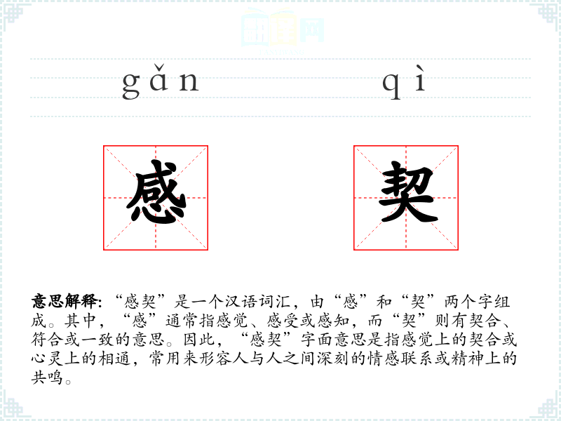 “感契”是一个汉语词汇,由“感”和“契”两个字组成。其中,“感”通常指感觉、感受或感知,而“契”则有契合、符合或一致的意思。因此,“感契”字面意思是指感觉上的契合或心灵上的相通,常用来形容人与人之间深刻的情感联系或精神上的共鸣。