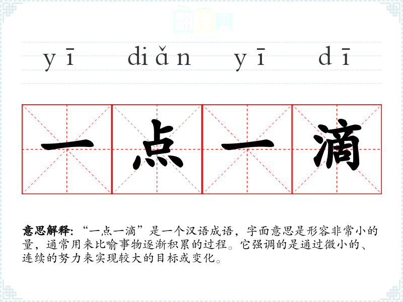 “一点一滴”是一个汉语成语,字面意思是形容非常小的量,通常用来比喻事物逐渐积累的过程。它强调的是通过微小的、连续的努力来实现较大的目标或变化。