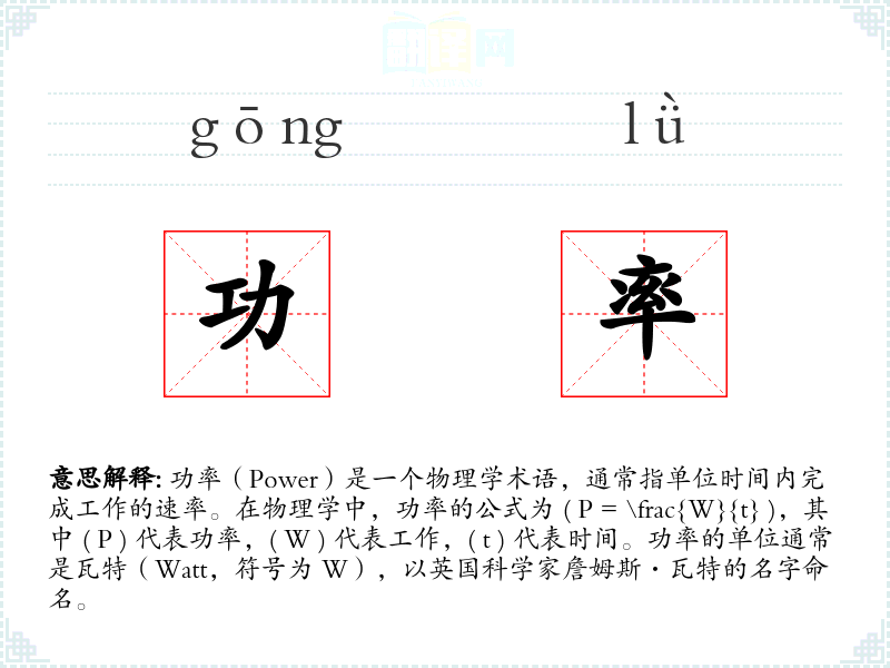 功率(Power)是一个物理学术语,通常指单位时间内完成工作的速率。在物理学中,功率的公式为 ( P = \frac{W}{t} ),其中 ( P ) 代表功率,( W ) 代表工作,( t ) 代表时间。功率的单位通常是瓦特(Watt,符号为 W),以英国科学家詹姆斯·瓦特的名字命名。