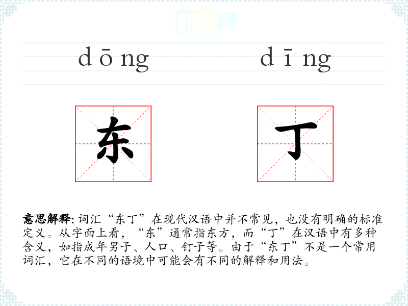 词汇“东丁”在现代汉语中并不常见,也没有明确的标准定义。从字面上看,“东”通常指东方,而“丁”在汉语中有多种含义,如指成年男子、人口、钉子等。由于“东丁”不是一个常用词汇,它在不同的语境中可能会有不同的解释和用法。