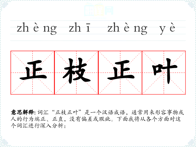 词汇“正枝正叶”是一个汉语成语,通常用来形容事物或人的行为端正、正直,没有偏差或瑕疵。下面我将从各个方面对这个词汇进行深入分析: