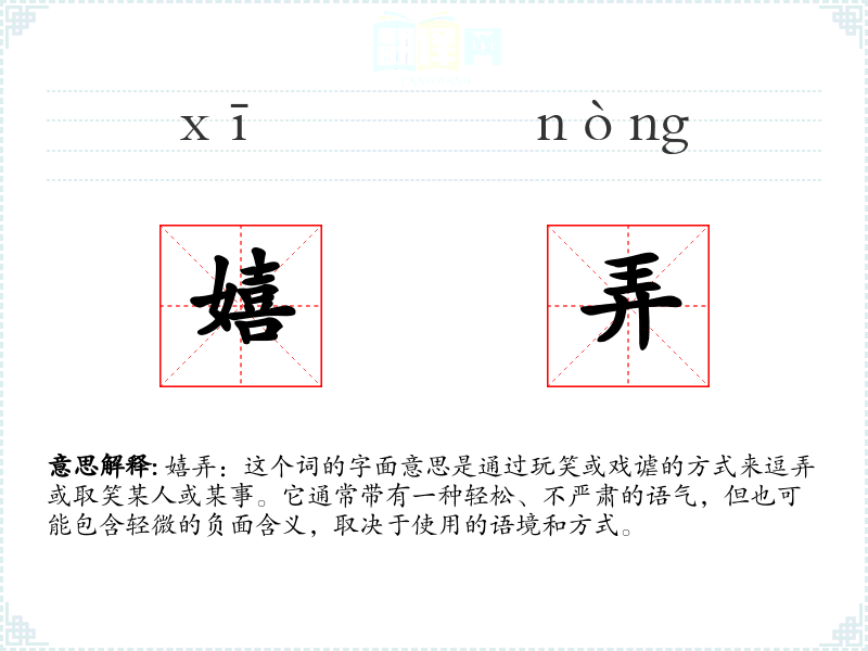 嬉弄:这个词的字面意思是通过玩笑或戏谑的方式来逗弄或取笑某人或某事。它通常带有一种轻松、不严肃的语气,但也可能包含轻微的负面含义,取决于使用的语境和方式。