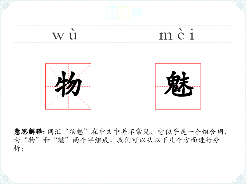 - 字面意思:物魅的字面意思可以理解为“物体的魅力”或“物体的吸引力”。