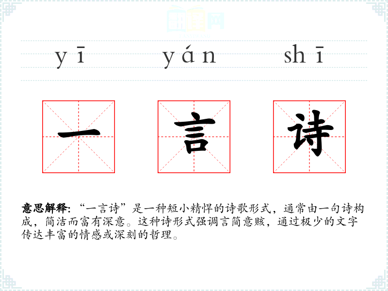 - 专业领域:在诗歌研究或文学批评中,“一言诗”可能被用作分析诗歌简洁性和表达力的一个例子。