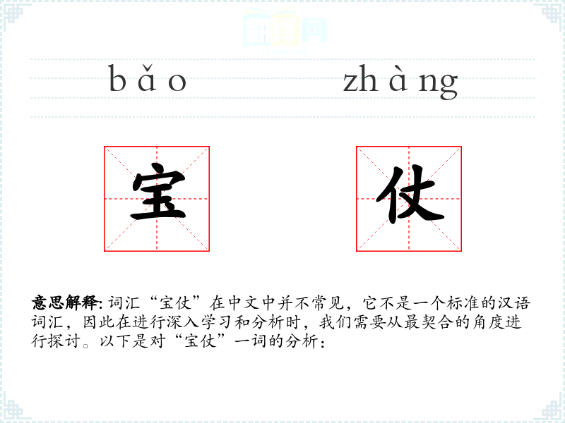 词汇“宝仗”在中文中并不常见,它不是一个标准的汉语词汇,因此在进行深入学习和分析时,我们需要从最契合的角度进行探讨。以下是对“宝仗”一词的分析: