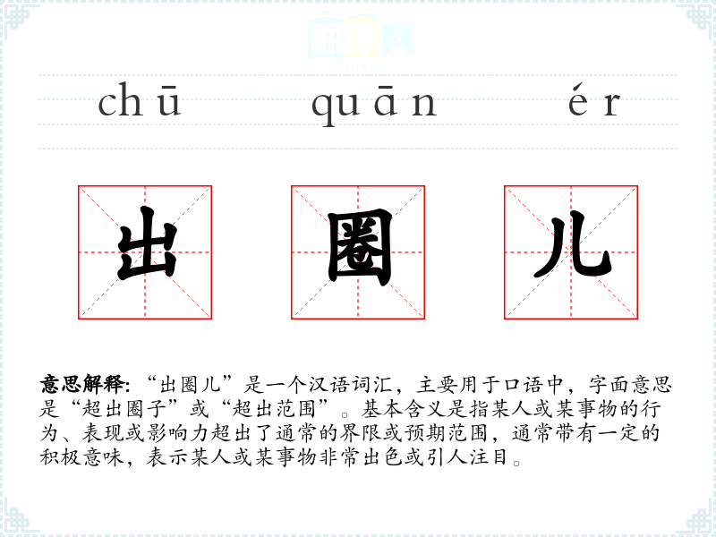 “出圈儿”是一个汉语词汇,主要用于口语中,字面意思是“超出圈子”或“超出范围”。基本含义是指某人或某事物的行为、表现或影响力超出了通常的界限或预期范围,通常带有一定的积极意味,表示某人或某事物非常出色或引人注目。