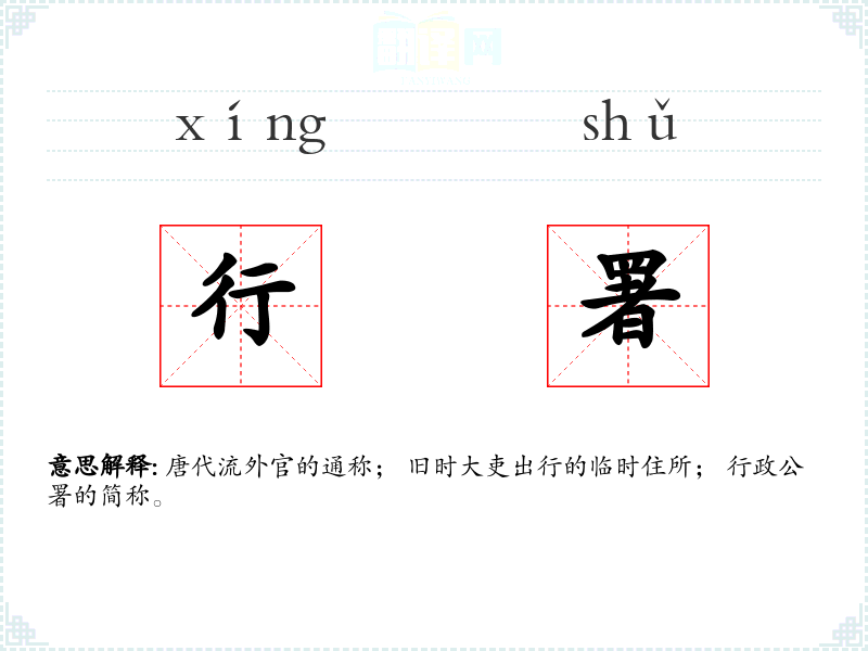 唐代流外官的通称; 旧时大吏出行的临时住所; 行政公署的简称。