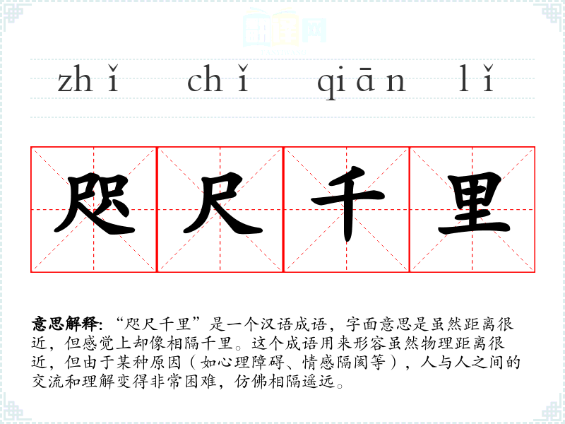 “咫尺千里”是一个汉语成语,字面意思是虽然距离很近,但感觉上却像相隔千里。这个成语用来形容虽然物理距离很近,但由于某种原因(如心理障碍、情感隔阂等),人与人之间的交流和理解变得非常困难,仿佛相隔遥远。