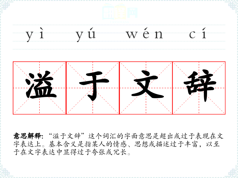 “溢于文辞”这个词汇的字面意思是超出或过于表现在文字表达上。基本含义是指某人的情感、思想或描述过于丰富,以至于在文字表达中显得过于夸张或冗长。