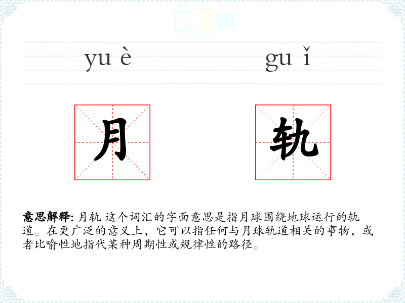月轨 这个词汇的字面意思是指月球围绕地球运行的轨道。在更广泛的意义上,它可以指任何与月球轨道相关的事物,或者比喻性地指代某种周期性或规律性的路径。