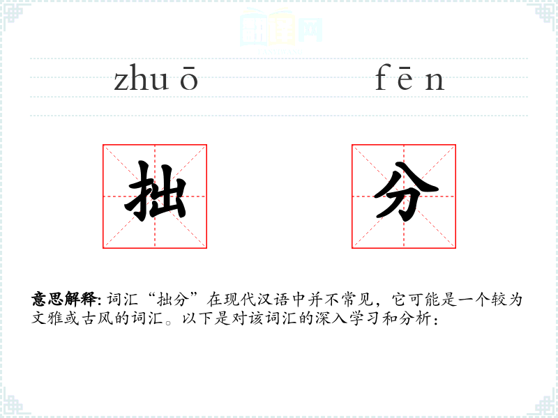 词汇“拙分”在现代汉语中并不常见,它可能是一个较为文雅或古风的词汇。以下是对该词汇的深入学*和分析: