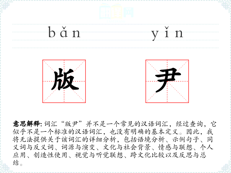 词汇“版尹”并不是一个常见的汉语词汇,经过查询,它似乎不是一个标准的汉语词汇,也没有明确的基本定义。因此,我将无法提供关于该词汇的详细分析,包括语境分析、示例句子、同义词与反义词、词源与演变、文化与社会背景、情感与联想、个人应用、创造性使用、视觉与听觉联想、跨文化比较以及反思与总结。