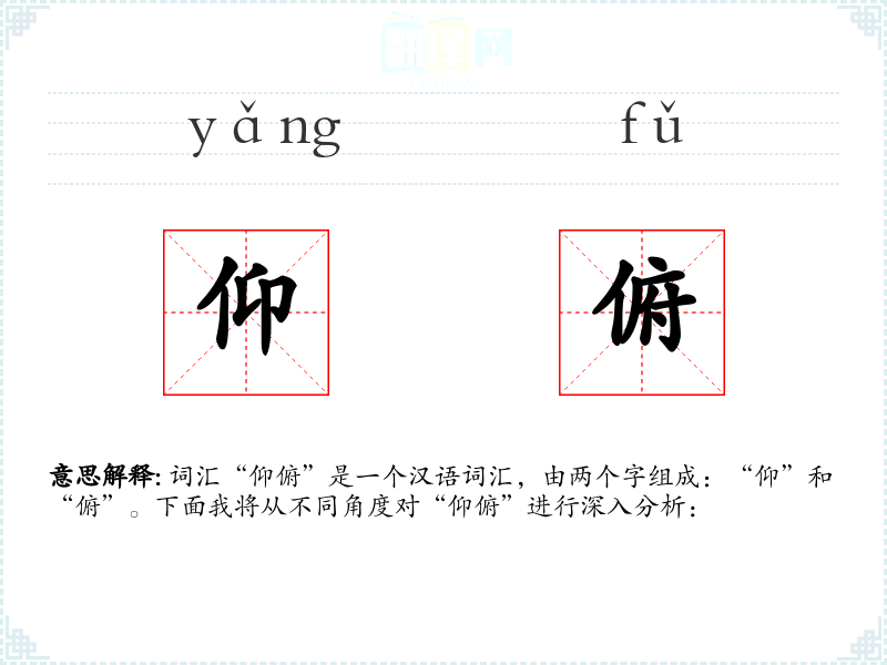 - 对应词汇:在英语中,“仰”可以对应“look up”或“admire”,“俯”可以对应“look down”或“bow”。