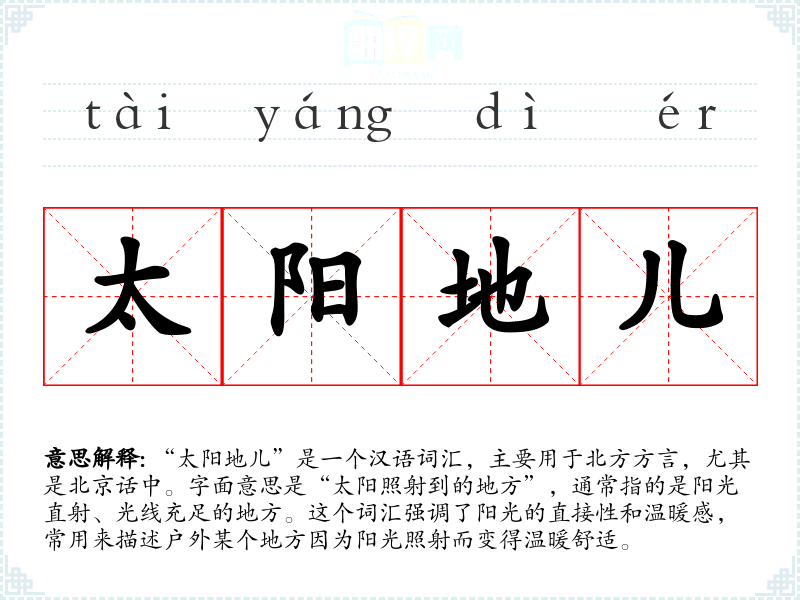 “太阳地儿”是一个汉语词汇,主要用于北方方言,尤其是北京话中。字面意思是“太阳照射到的地方”,通常指的是阳光直射、光线充足的地方。这个词汇强调了阳光的直接性和温暖感,常用来描述户外某个地方因为阳光照射而变得温暖舒适。
