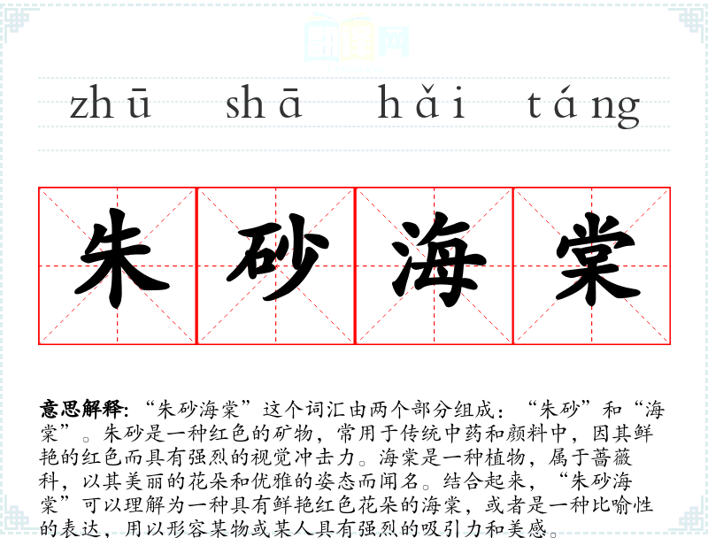 “朱砂海棠”这个词汇由两个部分组成:“朱砂”和“海棠”。朱砂是一种红色的矿物,常用于传统中药和颜料中,因其鲜艳的红色而具有强烈的视觉冲击力。海棠是一种植物,属于蔷薇科,以其美丽的花朵和优雅的姿态而闻名。结合起来,“朱砂海棠”可以理解为一种具有鲜艳红色花朵的海棠,或者是一种比喻性的表达,用以形容某物或某人具有强烈的吸引力和美感。