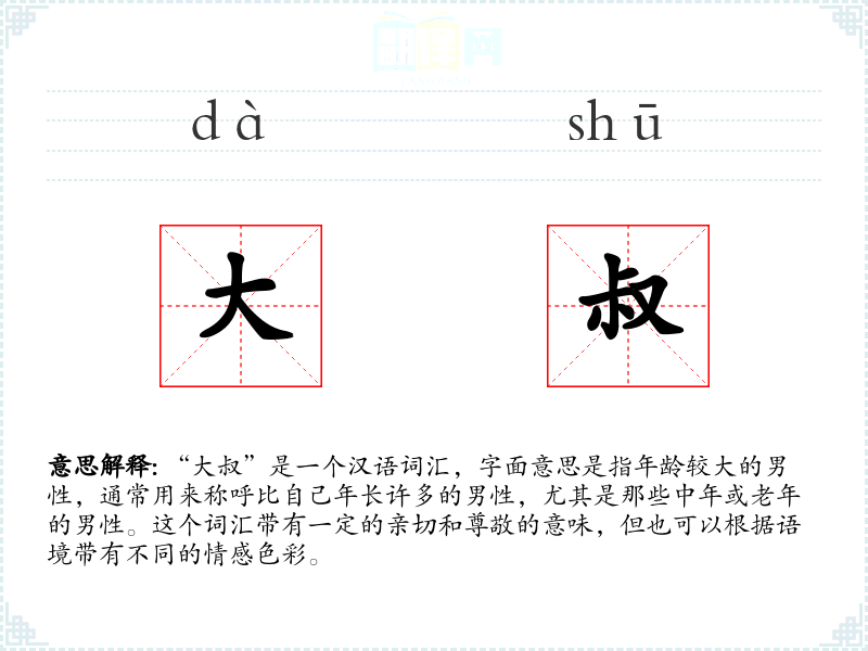 - 文学:在文学作品中,“大叔”可能被用来塑造一个慈祥、智慧或者有些古板的角色形象。