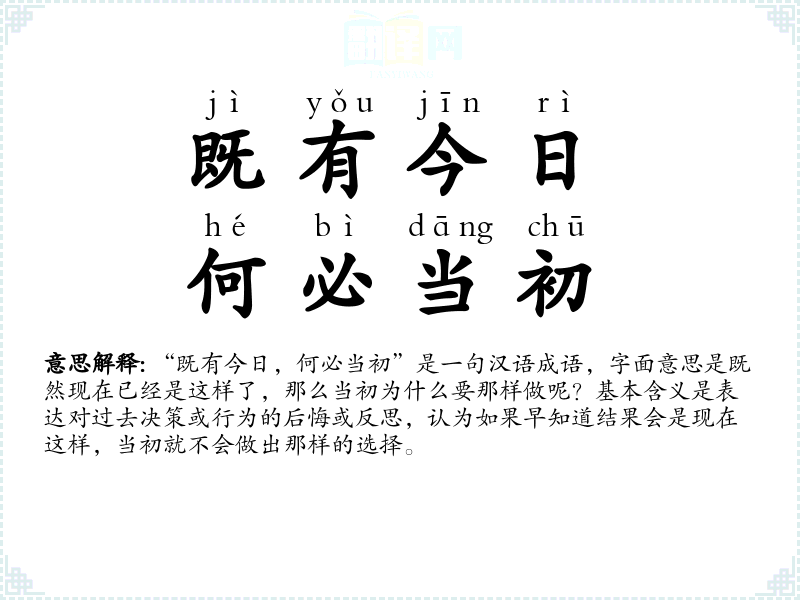 "既有今日,何必当初"的意思解释、既有今日,何必当初是什么意思由翻译网汉语词典查词提供。