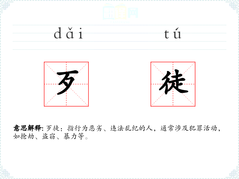 - 词源:“歹”字在古代汉语中意为“不好”,“徒”指人,合起来即指行为不好的人。