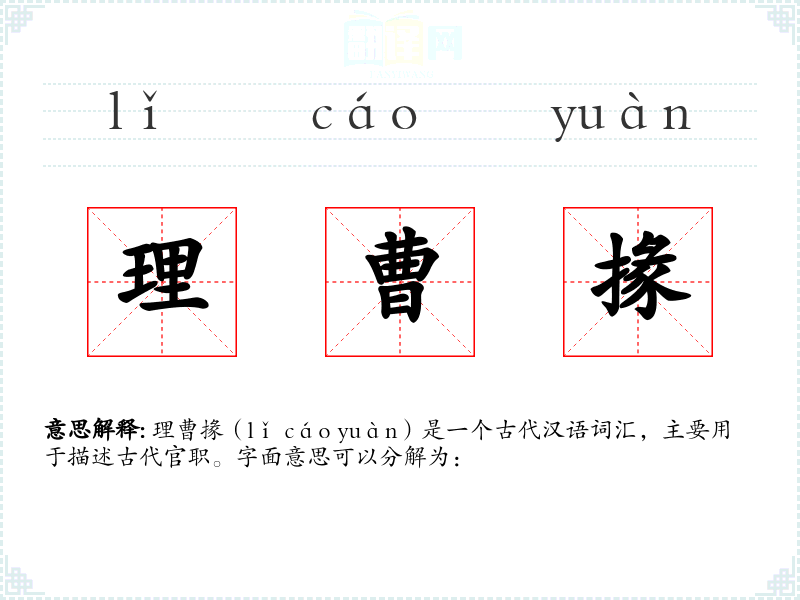 理曹掾(lǐ cáo yuàn)是一个古代汉语词汇,主要用于描述古代官职。字面意思可以分解为: